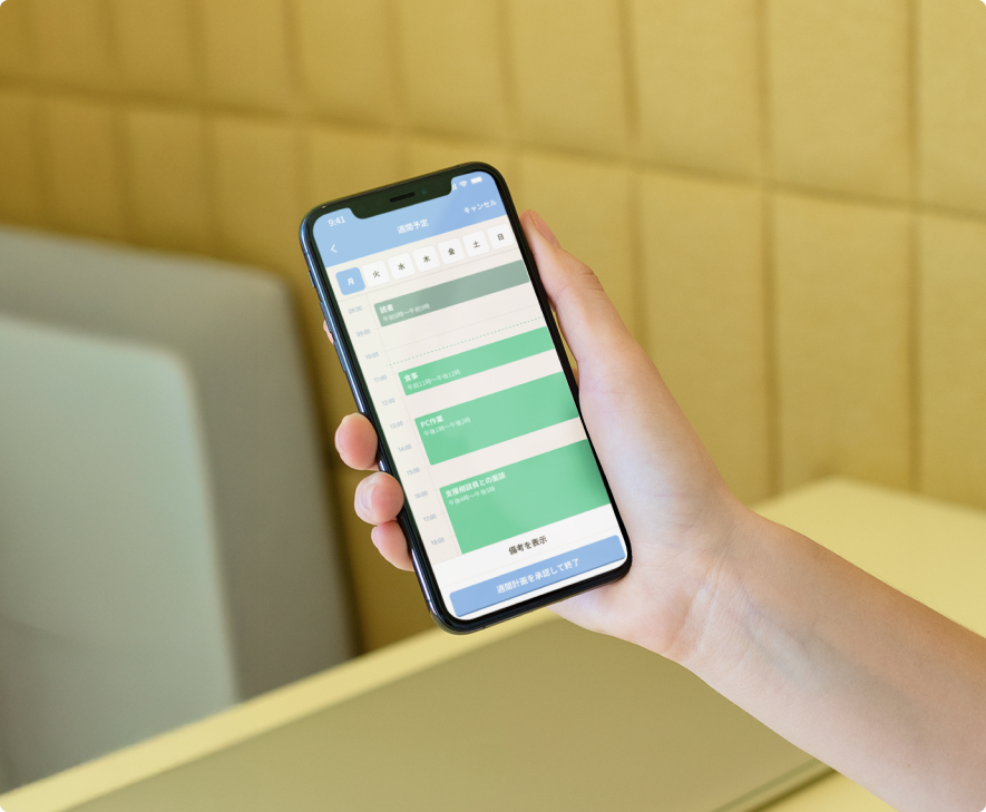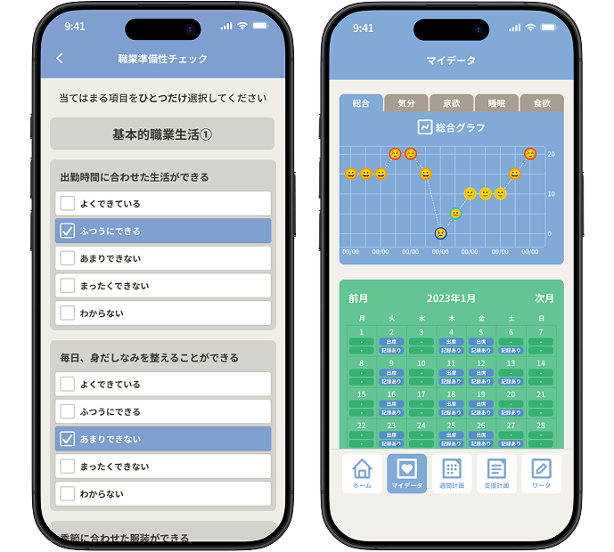 就労移行支援事業所ワークフォーでは、入室打刻から日々の体調・生活習慣の記録、スケジュールの確認やさらに復職にむけたチェックシートまで、ご利用者様一人ひとりの状況を把握しながら日々の支援をスムーズに行うためのアプリを導入しています。