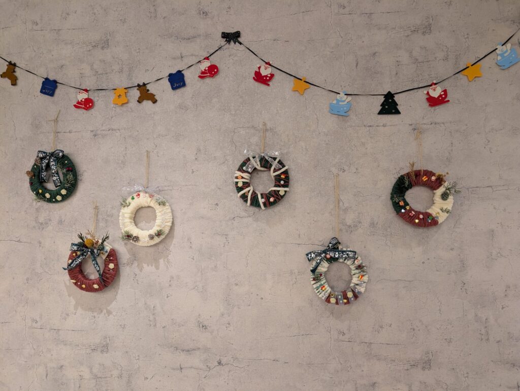 毛糸の巻き方や飾りの配置にもそれぞれの個性が表れ、同じ材料を使っていても、世界に一つだけの素敵なリースが完成しました。